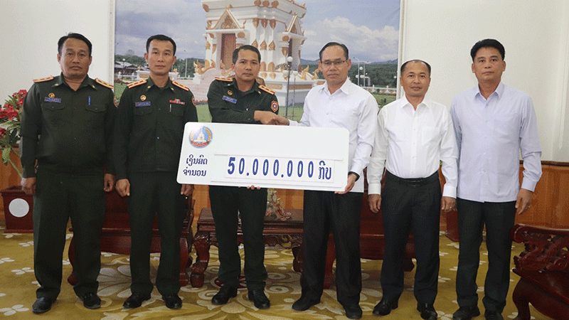 Senior officials in Bokeo province on Tuesday give 50 million kip to the Paktha district military command to support their operations in the area. --Photo Lao People’s Army News |
