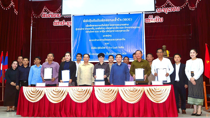 Officials from Salavan province’s Agriculture and Environment Department, the provincial investment promotion and management committee, Salavan and Vapy district authorities, and U Feel Leaf Co., Ltd. executives last week approve a feasibility study of a fruit tree plantation involving five villages in the two districts. --Photo Pathetlao |