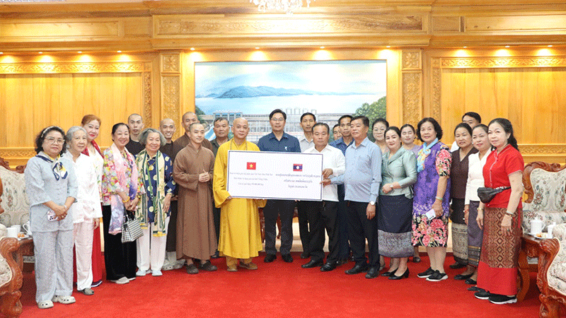 A Vietnamese Buddhist charitable delegation on Saturday gives 150 million kip to representatives of Vientiane province to help improve the lives of underprivileged families in five districts of the province. --Photo Pathetlao |