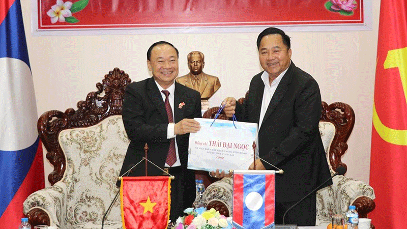 A senior official from Gia Lai province in Vietnam on Sunday gives US$50,000 to a representative of Xekong province as a Lao New Year gift to support social and economic development efforts. --Photo Pasaxon |