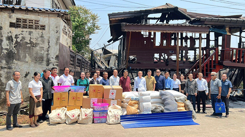 Champasak authorities, Party Committee members, and Pakse city authorities last week deliver rice, mosquito nets, blankets, cash and other supplies worth 153 million kip to five families in Khanthong village whose houses were damaged in a fire last Thursday. --Photo Champamai newspaper |