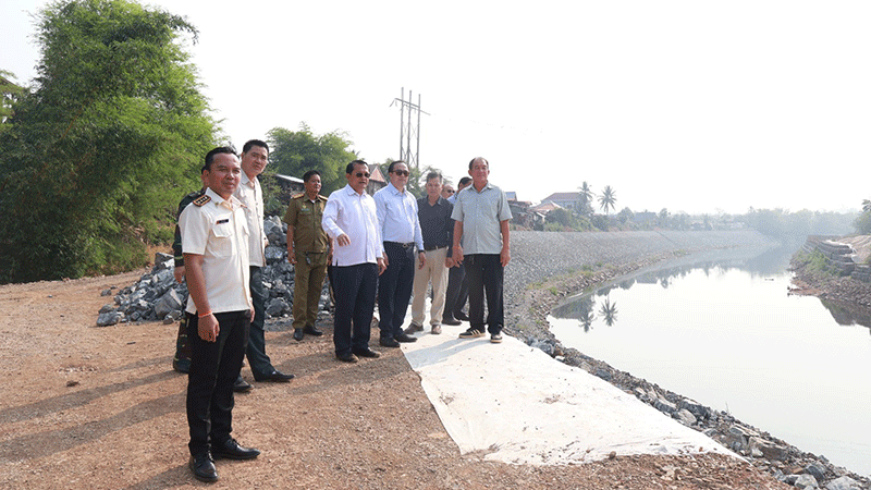 Xayabouly provincial authorities and Kaenthao district officials on Tuesday monitor the progress of construction of an embankment along the Heuang River in Phuan village. The embankment is being built in two sections, 590 metres and 300 metres long respectively. Construction work is now 87 percent complete, with the price tag expected to reach 17 billion kip. --Photo Pasaxon |