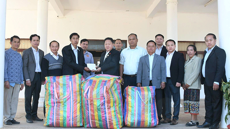 Deputy Head of the Party Central Committee’s Propaganda and Training Committee, Mr Laopaoxong Navongxay, and his staff on Tuesday give cash and clothing to officials in Viengthong district, Bolikhamxay province, for distribution to impoverished families.--Photo Pasaxon |