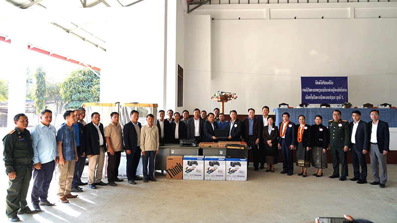 Officials from Luang Prabang province’s Agriculture and Environment Department on Tuesday give 14 desks, 2 filing cabinets, IT equipment, and 8 motorcycles to Phonthong district officials for use in the course of their work. --Photo Luang Prabang TV |