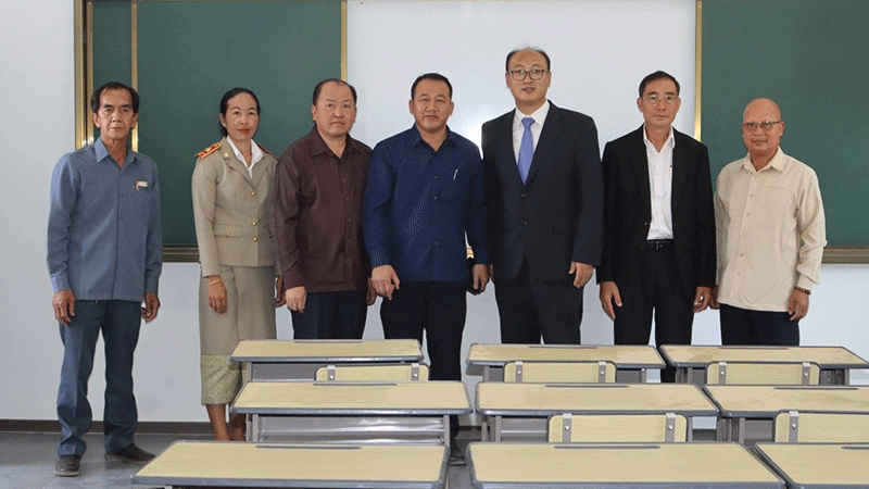 Representatives from the Lao Front for National Development and an ethnic vocational technical college in China on Monday hand over a new school building to staff at the lower secondary school in Viengkeo village, Xaythany district, Vientiane. The construction cost was about 610 million kip. Fifty student desks, two air conditioners and 10 computers worth 90 million kip were also provided. --Photo Pasaxon |