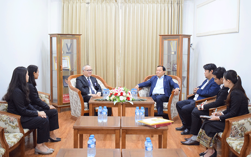 Director of Bangkok Chain International (Lao) Co., Ltd., Dr Watthana Pareesri (seated third left), briefs the LNCCI Executive Vice President, Mr Daovone Phachanthavong (right), about business operations.