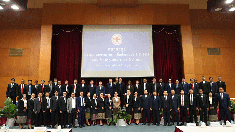 Prime Minister Sonexay Siphandone, President of the Lao Red Cross Mr Khamlavanh Chanthalavanh and representatives from provinces attend the annual Lao Red Cross meeting in Vientiane last week to review operations carried out in 2025 and set the plan of work for 2026. --Photo Tadam |