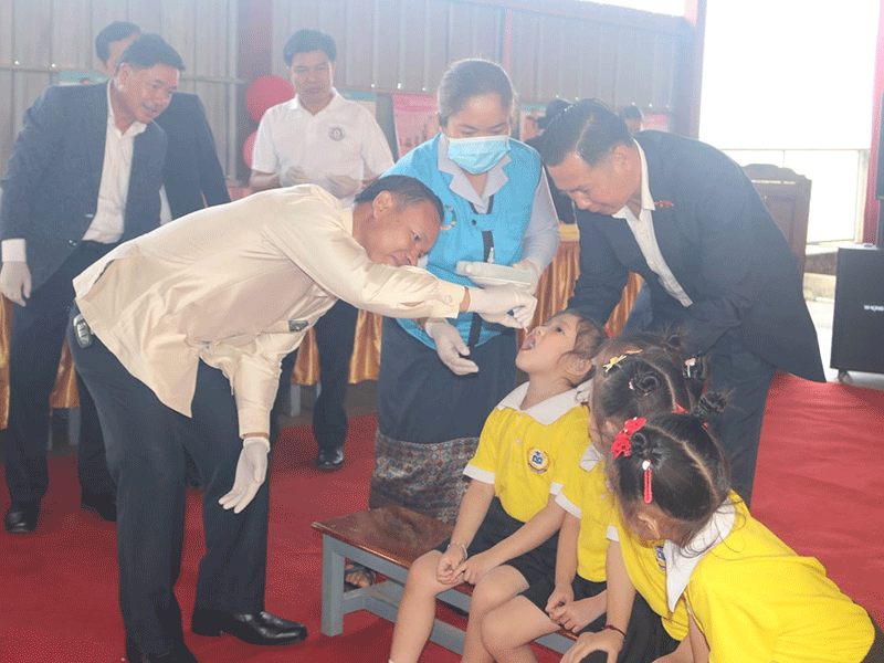 Provincial and district officials in Huayxai district, Bokeo province, on Monday help immunise children against polio and measles. Children aged 0-59 months throughout the province are being given the oral vaccination to protect them against these two childhood diseases. --Photo Bounchan Bounpanya |
