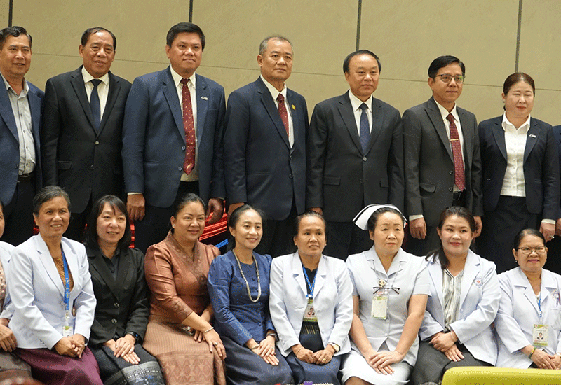 Senior staff from Mahosot Hospital and the Lao Development Bank Co., Ltd. and invited guests, together with Minister of Health Dr Bounfeng Phoummalaysith, meet for the signing of a Memorandum of Understanding on cooperation between the hospital and the bank. The bank will set up a modern and secure payment system for patients using the hospital’s services. |