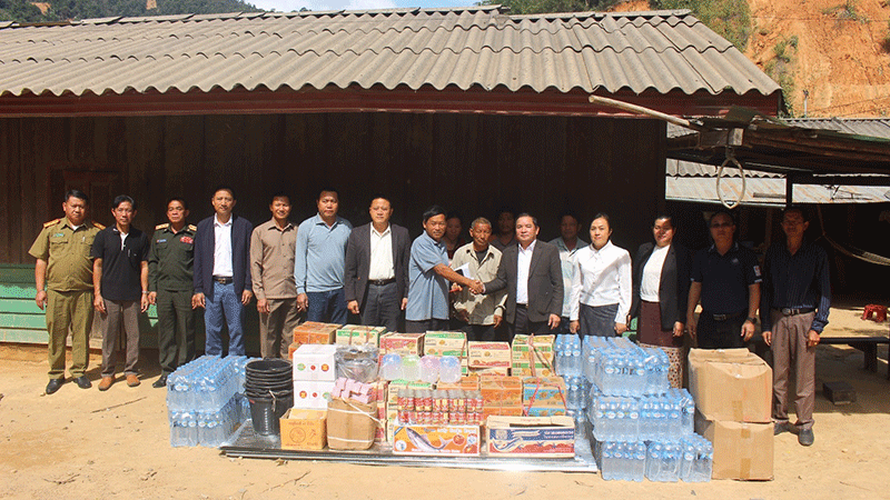 Xiengkhouang authorities on Wednesday deliver clothing, household items, 240 zinc sheets, nails and other items worth over 24 million kip to Phoukafe village authorities in Khoun district for distribution to families who suffered losses and property damage during storms last month. Provincial authorities also gave financial donations to the families of two people who died during flooding. --Photo Pathetlao |