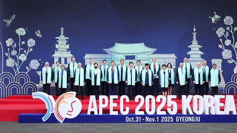 | President Xi Jinping and other leaders and representatives pose for a group photo after the second session of the 32nd APEC Economic Leaders’ Meeting in Gyeongju, South Korea. |