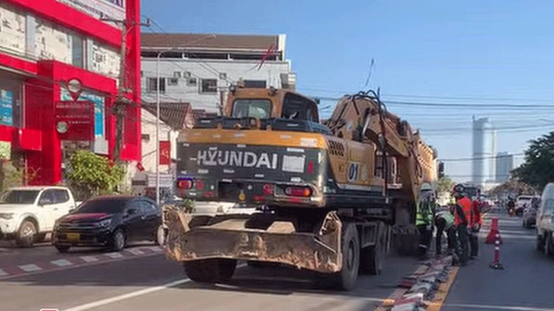 | Following instructions from the Ministry of Public Works and Transport, curbs are removed from Bus Rapid Transit lanes in Vientiane. |