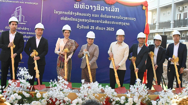 Minister of Culture and Tourism, Mrs Suanesavanh Vignaket (fourth left), Deputy Minister of Culture and Tourism, Mr Vansy Kuamua (fourth right), and other officials on Thursday take part in a groundbreaking ceremony to kick off construction of a 20-room dormitory for students and teachers at the National Arts College in Vientiane. The dormitory is expected to be completed by December 2028. --Photo Pasaxon |