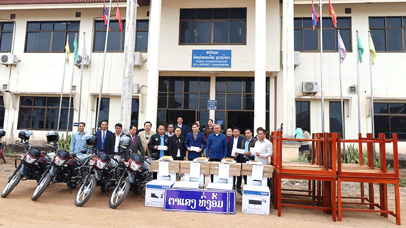 Luang Namtha provincial authorities on Wednesday give tables, chairs, computers, laptops, motorbikes and cash to representatives of Luang Namtha sub-districts that were recently created as part of administrative reform. The event was attended by the Governor of Luang Namtha province, Mr Viengsavath Siphandone, and representatives of districts, villages and related sectors. --Photo Pasaxon |