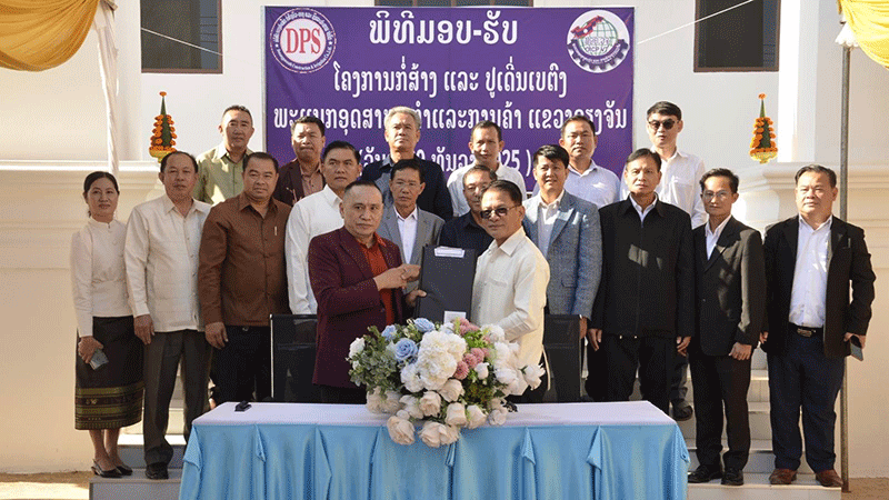 An executive from Duangpaseuth Construction Company on Monday officially hands over a newly built two-storey office, with patio and an outside drainage ditch, to a representative of Vientiane province’s Industry and Commerce Department. The company built the facility for the department at a cost of 13.38 billion kip, with work completed last month. --Photo Pathetlao |