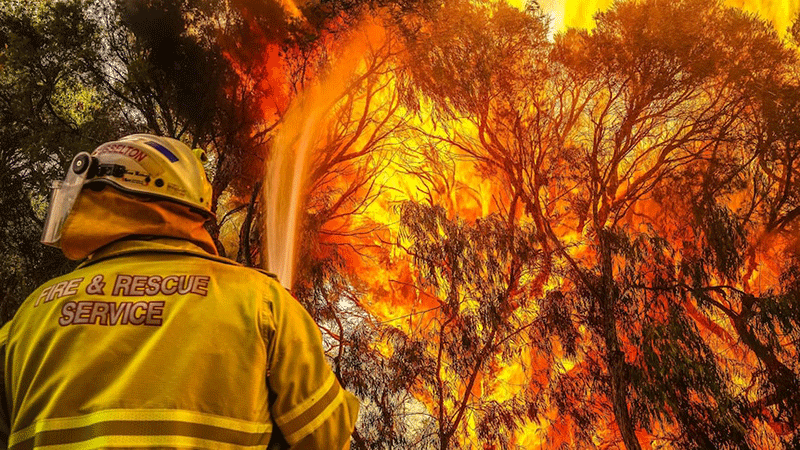 | Firefighters battled the blaze as it tore through the Marri Conservation Reserve in the town of Dunsborough in WA’s South West. (Supplied: Wallcliffe Volunteer Fire Brigade) |