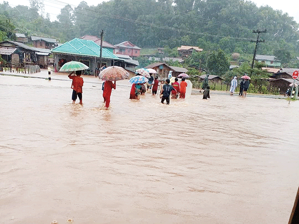 | People wade through a flooded street in Xekong province. --Photo Xekong provincial official |