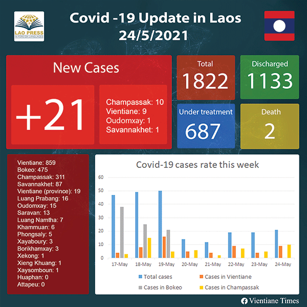 This brings the total number of Covid in Laos since March last year to 1,822. The positive test results were obtained after 1,126 samples were tested on May 23.