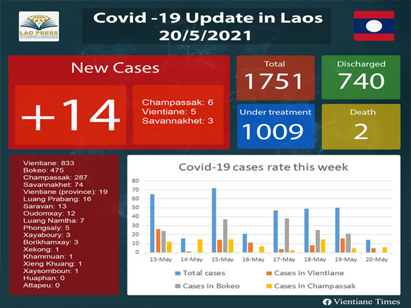 Laos recorded 14 new cases on Thursday, bringing the total number nationwide to 1,751, while 740 people have been discharged from hospitals.
