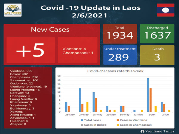 Four of the cases were reported in Vientiane while another (imported) case was reported in Champassak province. Meanwhile, 1,637 people have been discharged from hospitals.