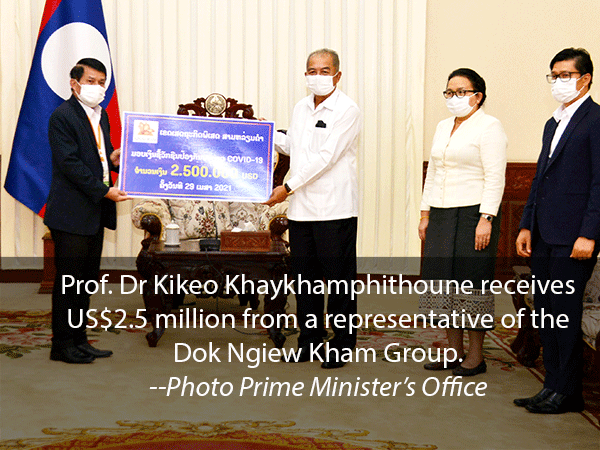 On Thursday, three donors provided US$2.5 million and 200 million kip worth of cash and supplies to Deputy Prime Minister and Chairman of the National Taskforce Committee for Covid-19 Prevention and Control, Prof. Dr Kikeo Khaykhamphithoune.