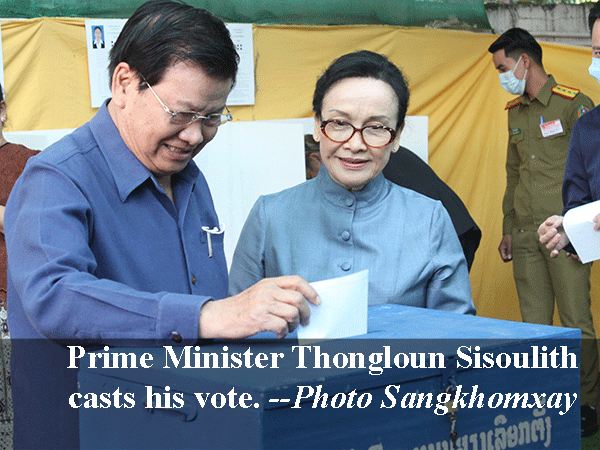 Prime Minister Thongloun and his wife Mrs Naly Sisoulith arrived at the polling station at the Thaphalanxay village office, Sisattanak district, at about 8am, joining villagers to elect representatives to the two parliaments.