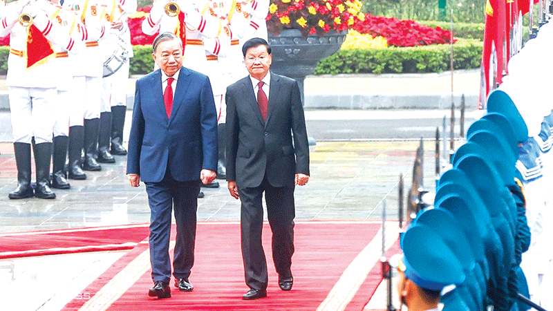 | Vietnam’s Party General Secretary To Lam (left) welcomes Laos’ Party General Secretary Thongloun Sisoulith to Hanoi on January 26. |