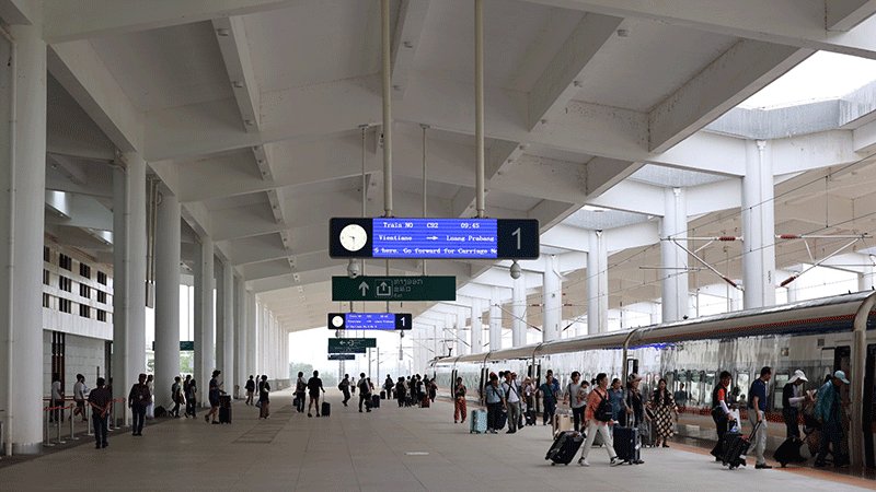 | Passengers are boarding the train at the Vientiane Station on the Laos-China Railway, heading for northern provinces of Laos. The railway has brought large number of tourists to Laos. |