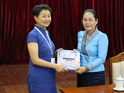 Counsellor of the Mission of China to ASEAN Geng Hailing (left), who leads the media delegation on the tour, presents a gift to Mrs Darany Phommavongsa. |
