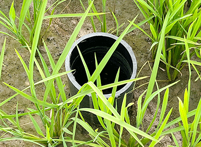| A tube is inserted into the ground to monitor the underground water level. The rice is not submerged in water but the ground still has sufficient moisture, in line with the Alternate Wetting and Drying method. |