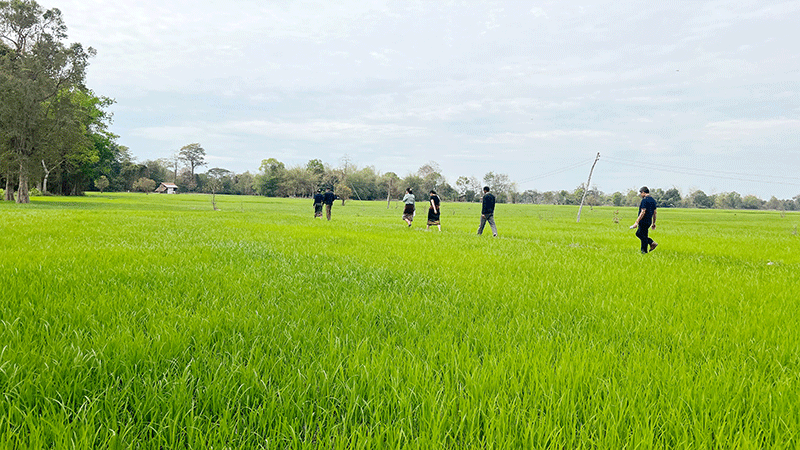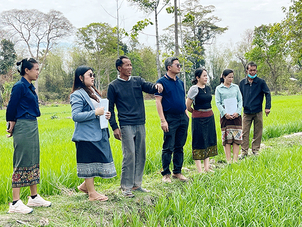| Ms Oulavanh Sinsamphanh (second left) and her team monitor the progress of work with a farmer in his ricefield. |