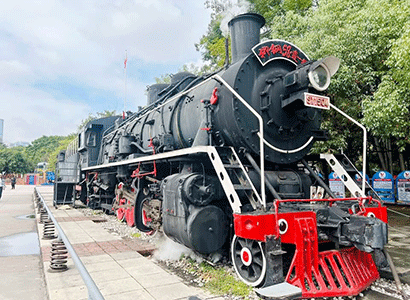 | An old steam train on display outside the Liuzhou Industrial Museum. |