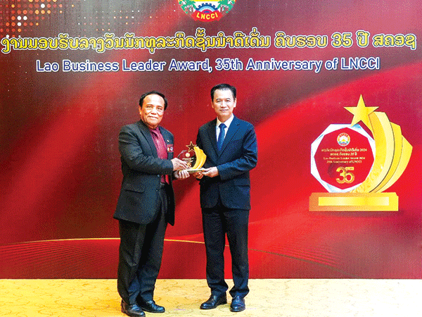 | Minister Malaythong Kommasith (right) presents the 2024 Lao Business Leader Award to Mr Saman Aneka. |