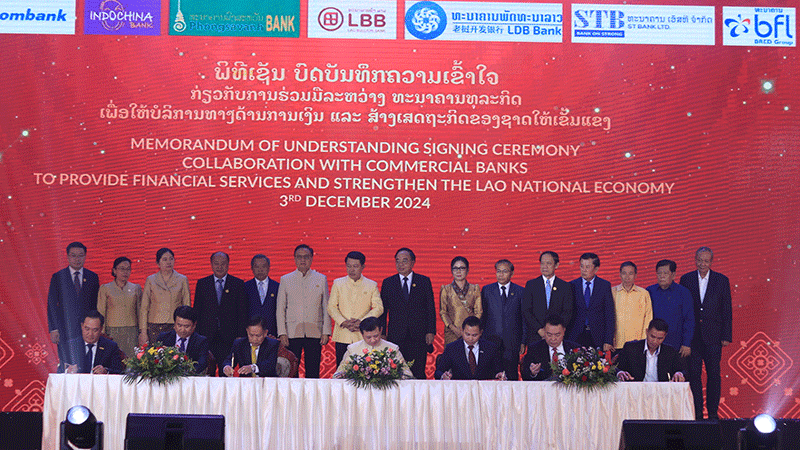 | Dr Chanthone Sitthixay (centre) signs business and strategic cooperation agreements with representatives of commercial banks. |