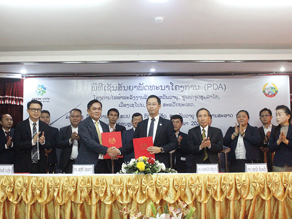 | Deputy Minister of Planning and Investment Dr Sthabandith Insisiengmay (right) shakes hands with the Managing Director of Savan Vayu Renewable Energy Co., Ltd. (SVARE), Mr Sengsack Xayarath, after they signed a Project Development Agreement on February 14. |