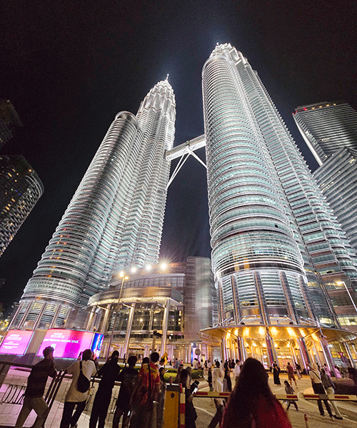 | People gather to take photos of the Petronas Towers (Malay: Menara Berkembar Petronas), also known as the Petronas Twin Towers and colloquially the KLCC Twin Towers, an interlinked pair of 88-storey skyscrapers in Kuala Lumpur. |