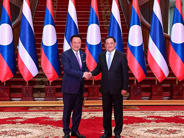 | Prime Minister Sonexay Siphandone (right) welcomes his Thai counterpart Anutin Charnvirakul during his official visit to Laos on October 16, 2025. |