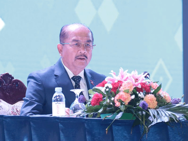 | President of the Lao Front for National Development, Prof.Dr Kikeo Khaykhamphithoune, speaks at a meeting on child healthcare. |