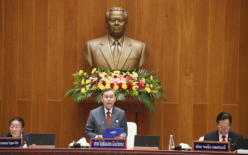 | Re-elected President Thongloun Sisoulith addresses the inaugural session of the 10th National Assembly on Monday. |