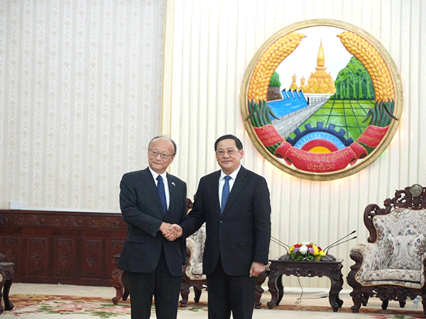 | ADB President Masato Kanda (left) greets Prime Minister Sonexay Siphandone during a courtesy call to the Prime Minister’s Office. |