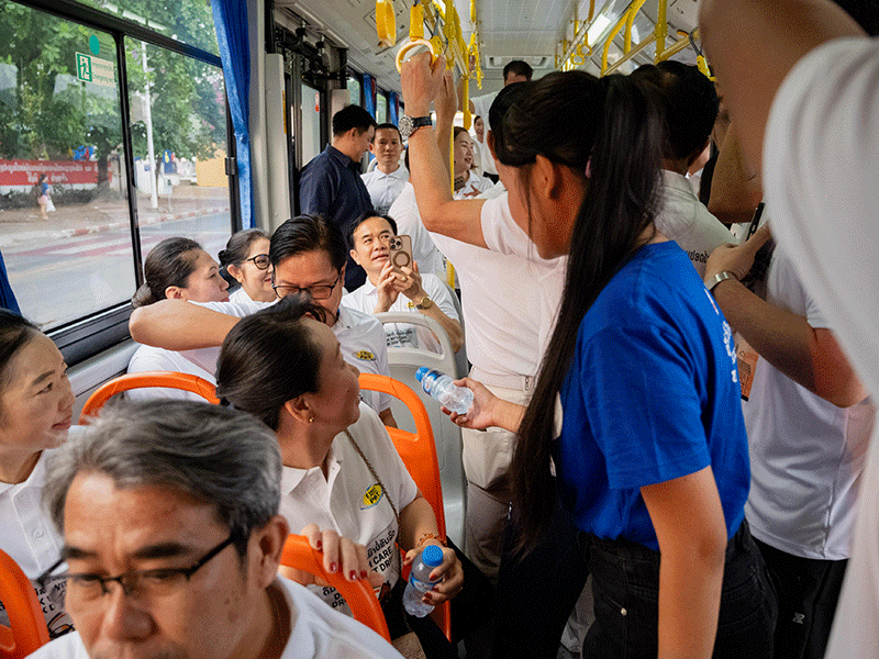 | Government officials and participants board a BRT bus to travel along a main thoroughfare in Vientiane as part of the campaign. |
