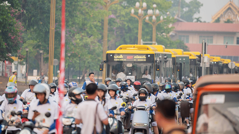 | Motorists and Bus Rapid Transit (BRT) vehicles join a road safety caravan travelling through major roads in Vientiane. |