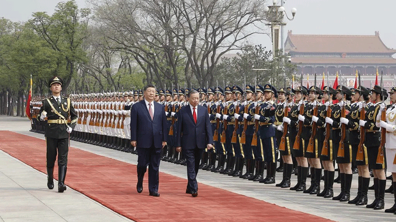 | General Secretary of the Communist Party of China (CPC) Central Committee and President of China Xi Jinping and General Secretary of the Communist Party of Vietnam (CPV) Central Committee and State President To Lam reviewed the Guard of Honour of the People's Liberation Army of China at the welcome ceremony on April 15. --Photo VNA/VNS |