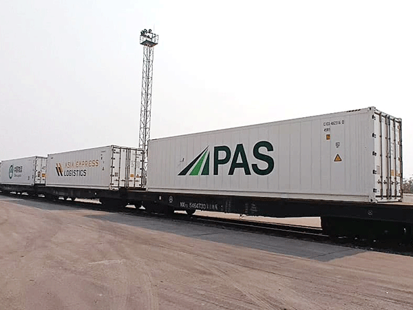 | Freight containers line up on wagons at Vientiane South train station, ready for cross-border transport. |