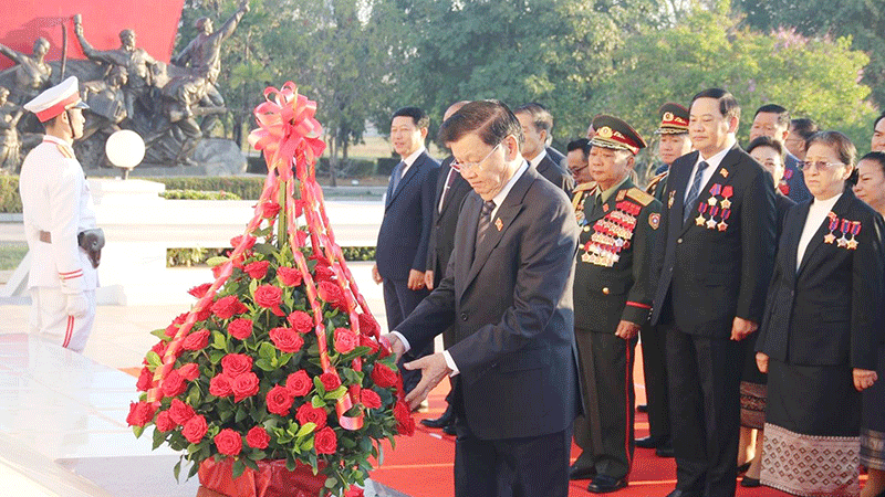 Secretary General of the Lao People’s Revolutionary Party, Mr Thongloun Sisoulith, and Party leaders on Monday place a wreath at the Unknown Soldiers’ Monument and a basket of flowers at the Kaysone Phomvihane Museum ahead of the 12th National Party Congress taking place from January 6-8. --Photo Vientiane Times |