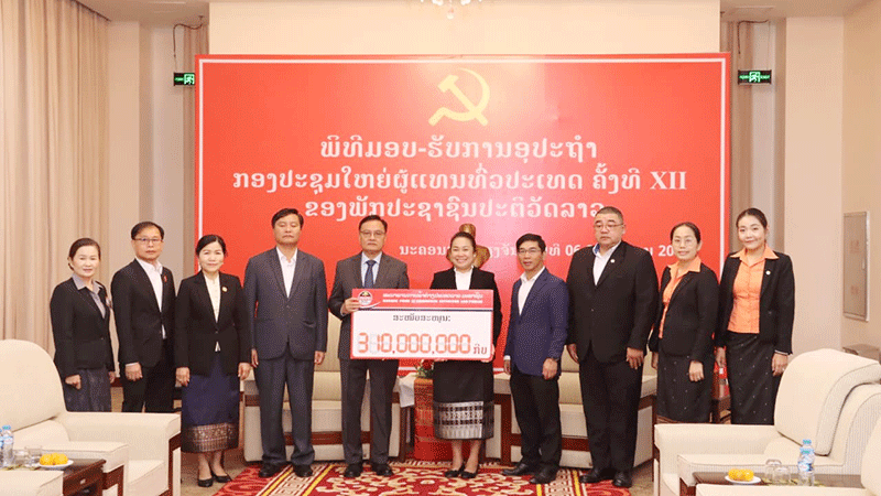 The Party Secretary of Xaysomboun province, Mr Phoykham Houngbounyuang (fourth right), and his officials on Monday present 200 million kip to Minister of Finance Mr Santiphab Phomvihane (fifth left) and his officials to help cover the cost of the 12th National Party Congress. --Photo Pathetlao |