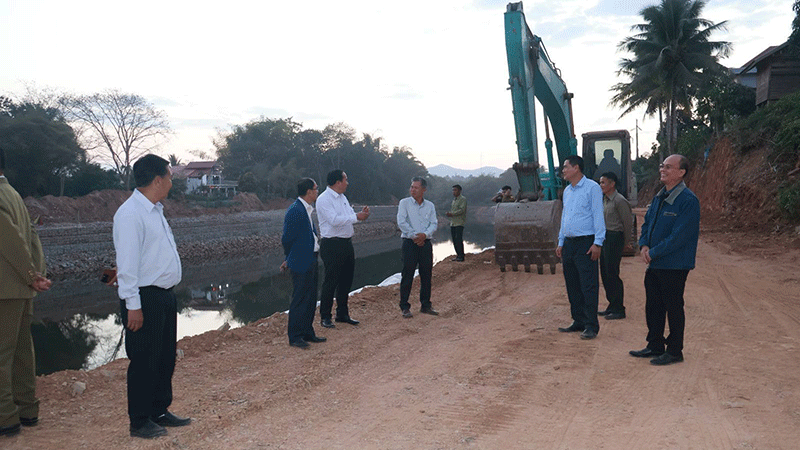 Members of the Xayabouly provincial Party Committee and the province’s Party Inspection Committee last week view the progress of construction of a 2,000-metre embankment along the Heuang River in Khonetapou and Phuan villages. The embankment is currently 61 percent complete. --Photo Pasaxon |