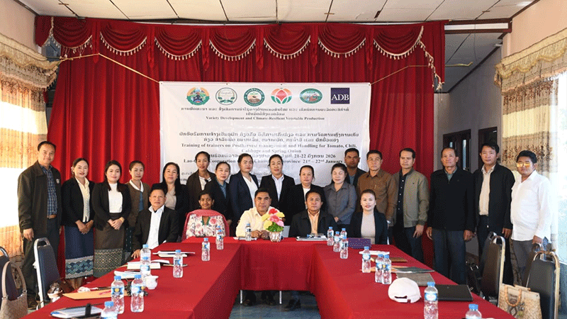 Officials from the Department of Agriculture’s Clean Agriculture Centre, part of the Ministry of Agriculture and Environment, including the Centre’s Deputy Director Mr Seangkeo Xayyavong (seated centre), last week attend a two-day workshop on efficient ways to handle vegetable crops such as tomatoes, peppers, cabbage, and spring onions. The workshop was organised by the World Vegetable Centre and the Clean Agriculture Centre to help reduce the 30 percent postharvest loss currently depleting the nation’s vegetable supply chain. |