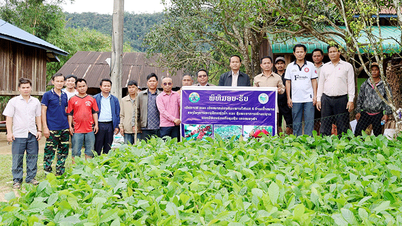 Officials from Attapeu province’s Agriculture and Environment Department, Xanxay district, and other individuals on Wednesday give 5,000 coffee tree seedlings to people in five villages and 500 cashew tree seedlings to Nongfamay village. The young plants will be planted so the crops can be harvested and provide villagers with extra income. --Photo Bounphanthong |