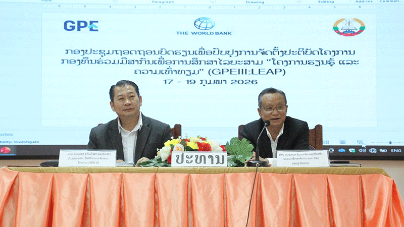 Deputy Director General of the Department of Planning, Mr Anoupheng Keovongsa (left), and Deputy Head of the Khammuan Provincial Education and Sports Department, Mr Duangmala Phommachan, chair a meeting in Khammuan province to discuss progress under Phase III of the Global Partnership for Education: Learning and Equity Project. |